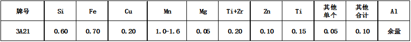 產品介紹 3A21鋁板為Al-Mn系合金,3A21鋁板是一種應用廣泛的防銹鋁,強度不高,不能熱處理強化,故常采用冷加工方法來提高其力學性能;在退火狀態下有高的塑性,在半冷作硬化時塑性尚好,冷作硬化時塑性低,耐蝕性好,焊接性良好,可切削性能不良。 化學成分